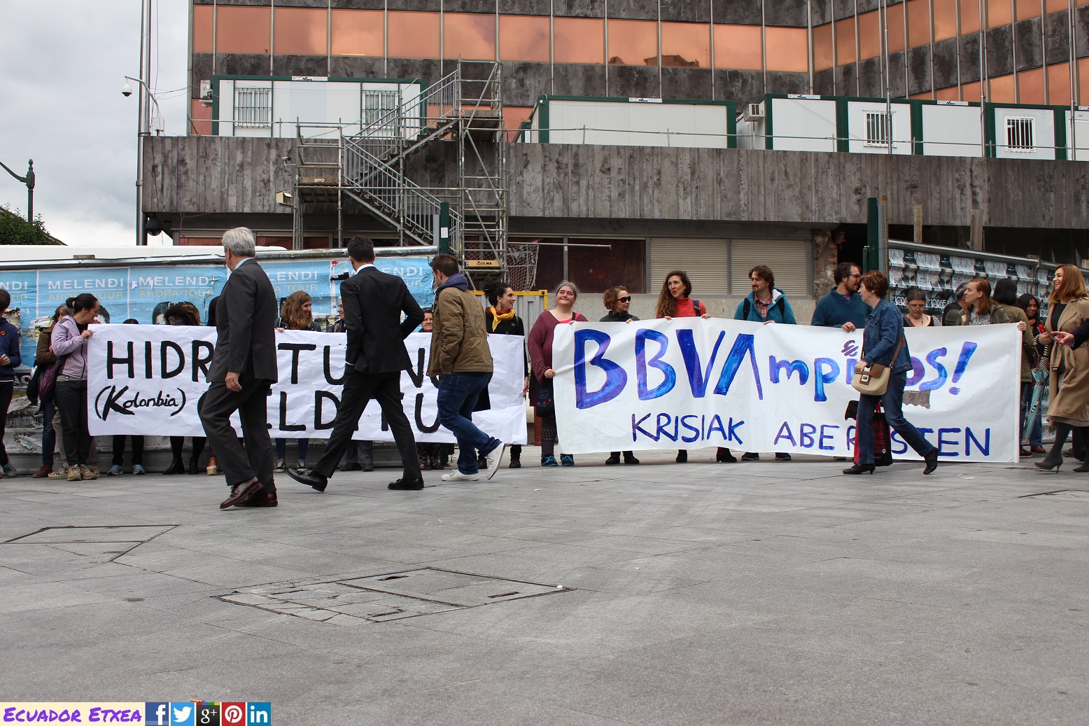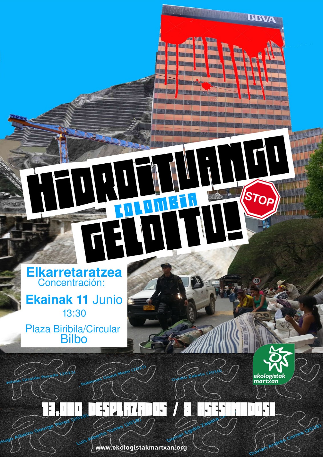 Ekainaren 11n BBVAren aurrean elkarretaratze bat burutu zuten hainbat pertsonek Ekologistak Martxan-ek deituta, banku honek finantzatzen duen Kolonbiako Hidroituango urtegia gelditzeko eskatuz. Proiektu horrek azken asteetan 13.000 pertsona kanporatu ditu, urtegiaren eraikuntzan akatsak egon direlako. Bien bitaretean urtegiaren eraikuntzern aurka zeuden 4 ekintzaile erail dituzte, eta ez dira lehenengoak aurretik ere beste lau erail bait dituzte Ituango aldean. Elkarretaratzean Euskal Herriko ekintzaileekin batera egon ziren Ituangokoak, Guatemala, Méxiko, Perú, El Salvador eta Estatuko beste tokikoak ere, batez ere “Miradas Criticas de Territorio”-ekin batera aritu ziren emakume asko.